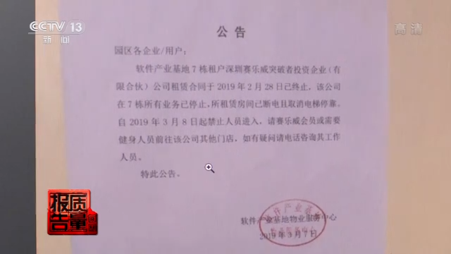 记者调查发现,除了金女士家小区未开业的那家分店外,赛乐威公司在深圳地区还有两家门店,其中南山店已于今年3月停止营业。为了弄清真相,记者来到来到电话里工作人员提供的地址:下沙地铁站外的水松大厦,一层临街清晰的挂着“赛乐威健身”的门牌,记者随即来到三楼。