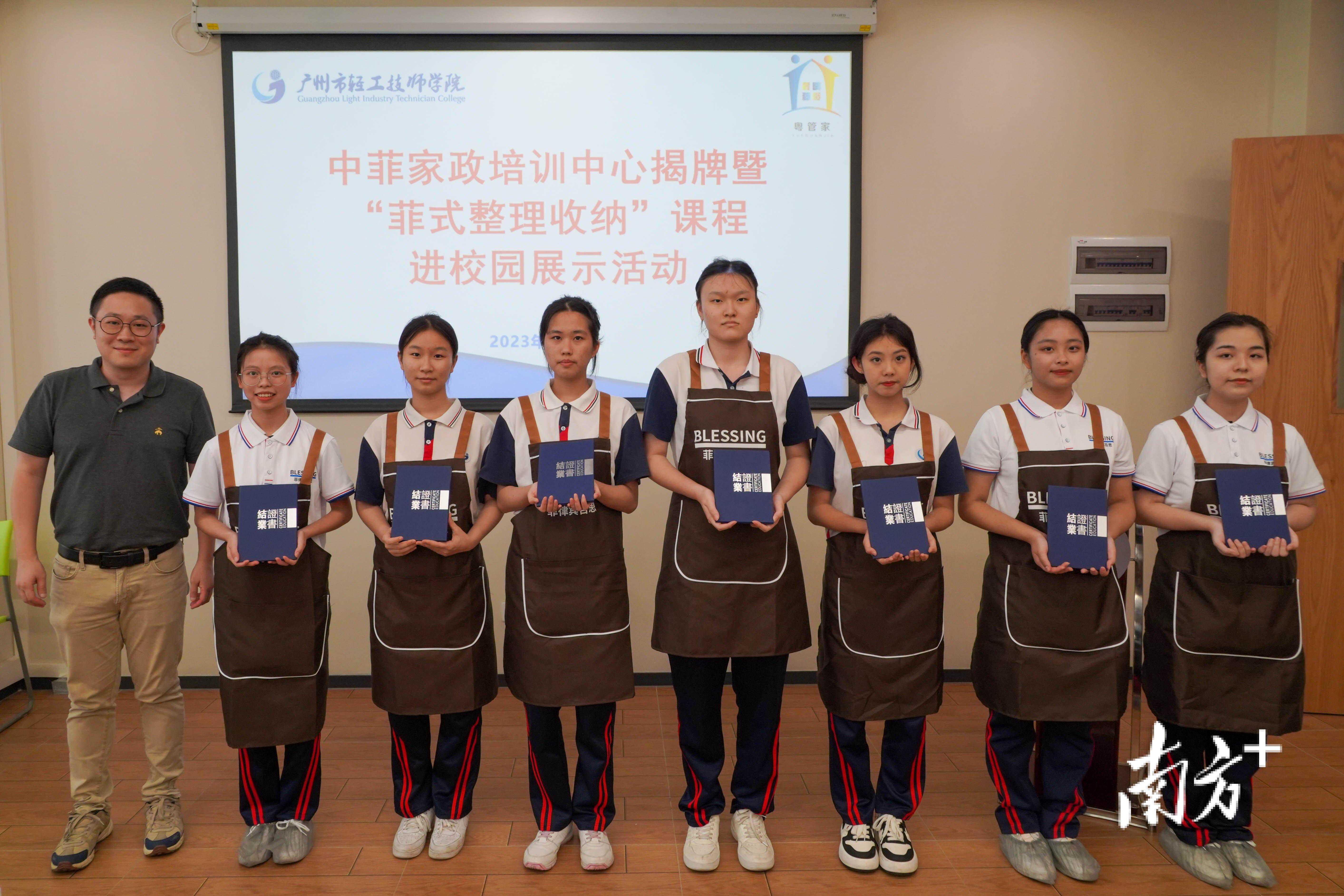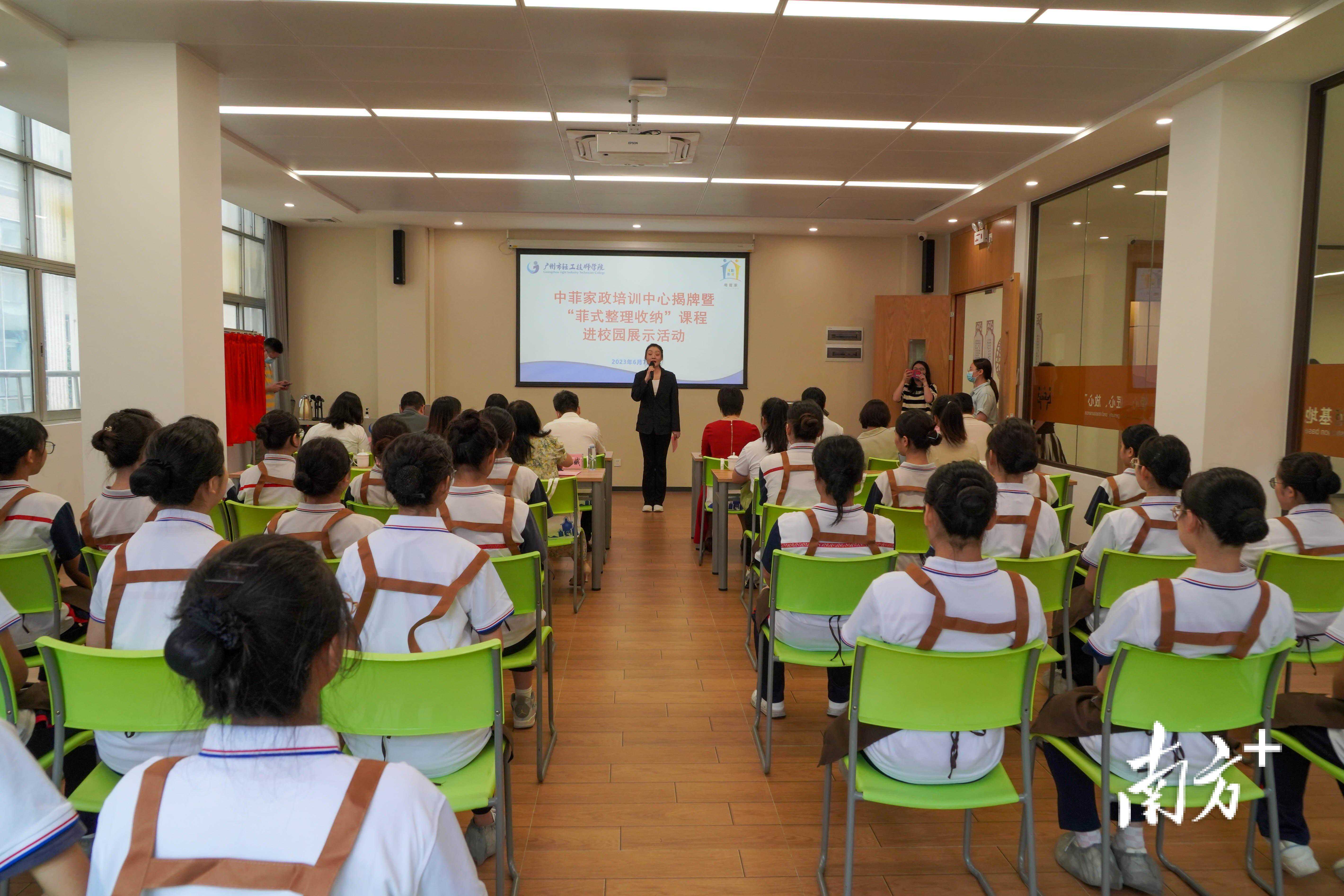 6月7日下午,广州市轻工技师学院在东校区举行中菲家政培训中心揭牌暨“菲式整理收纳”课程进校园展示活动,现场进行了中菲家政培训中心揭牌仪式。