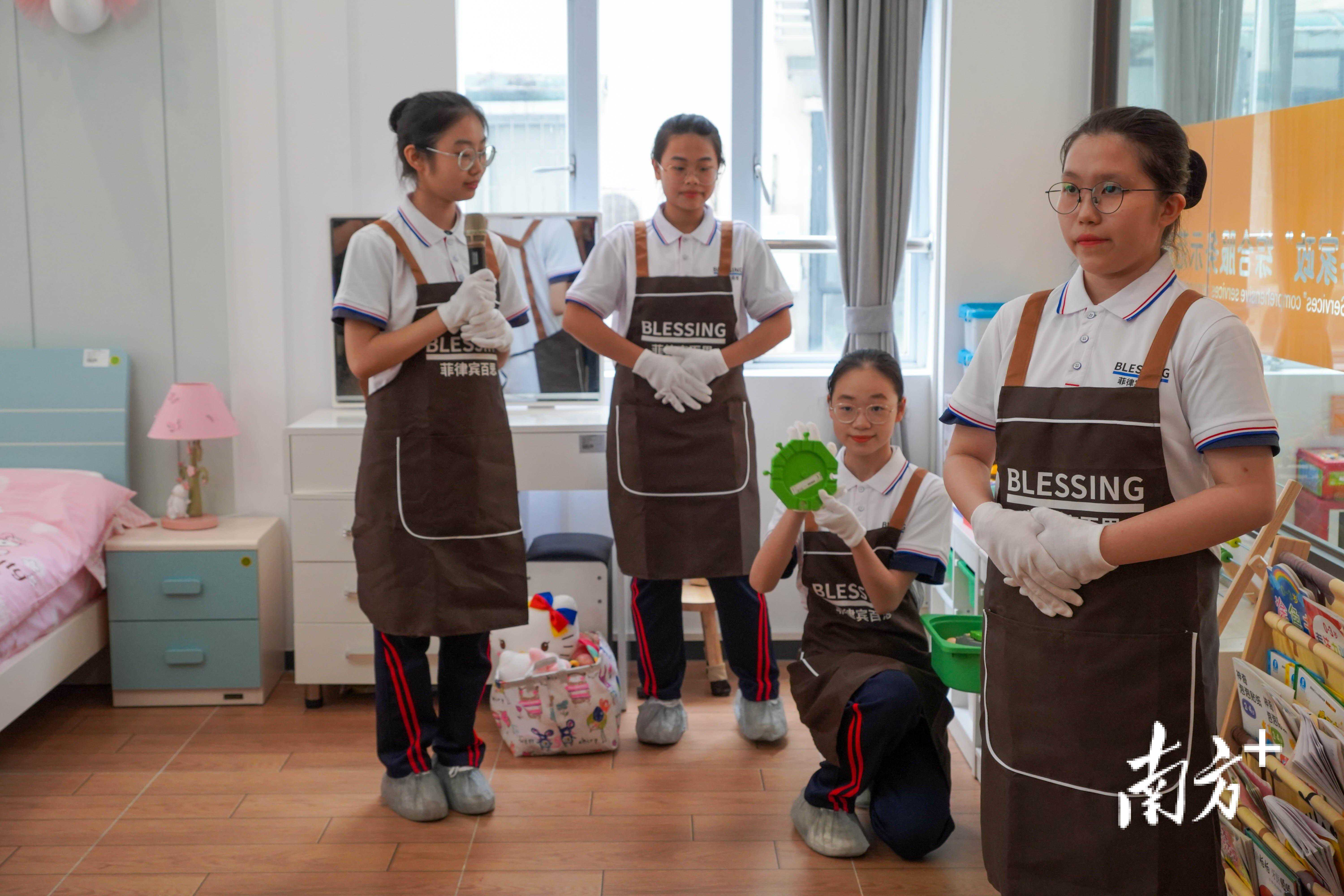 在广州市轻工技师学院广东省“南粤家政”综合服务示范基地,一群身着校服的轻工学员正在展示“菲式整理收纳”的课程成果,“梳妆台共分为两个区域,收纳标准是桌面上的物品必须从高到低,正面标志朝前摆放,桌面留白80%给到客户足够的操作空间。”现场,“收纳女孩”们拿出各种“收纳绝活”,从厨房到主卧再到儿童房,不同区域的各种物件在特定的需求下摆放整齐。