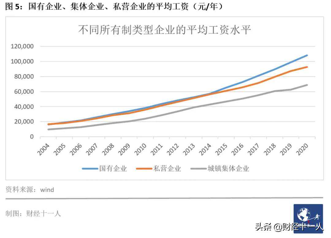 同时,企业的所有制性质也会影响工资水平。图5显示,从2004年到2014年,国有企业和私营企业的平均工资相差无几,但都明显高于城镇集体企业。2014年以后,国有企业平均工资开始和私营企业拉开差距,城镇集体企业仍然垫底。
