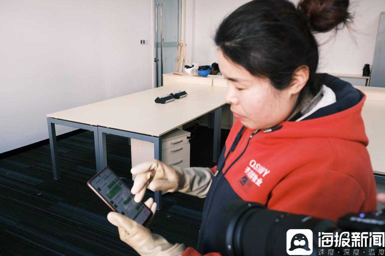 2月5日上午9点,在济南市市中区的一家公司内,海报新闻记者见到了正在做深度保洁的亓淑娟及其同事。过年期间,这家公司重新装修,将办公桌及地面、玻璃的清洁工作交给了亓淑娟和她的团队。