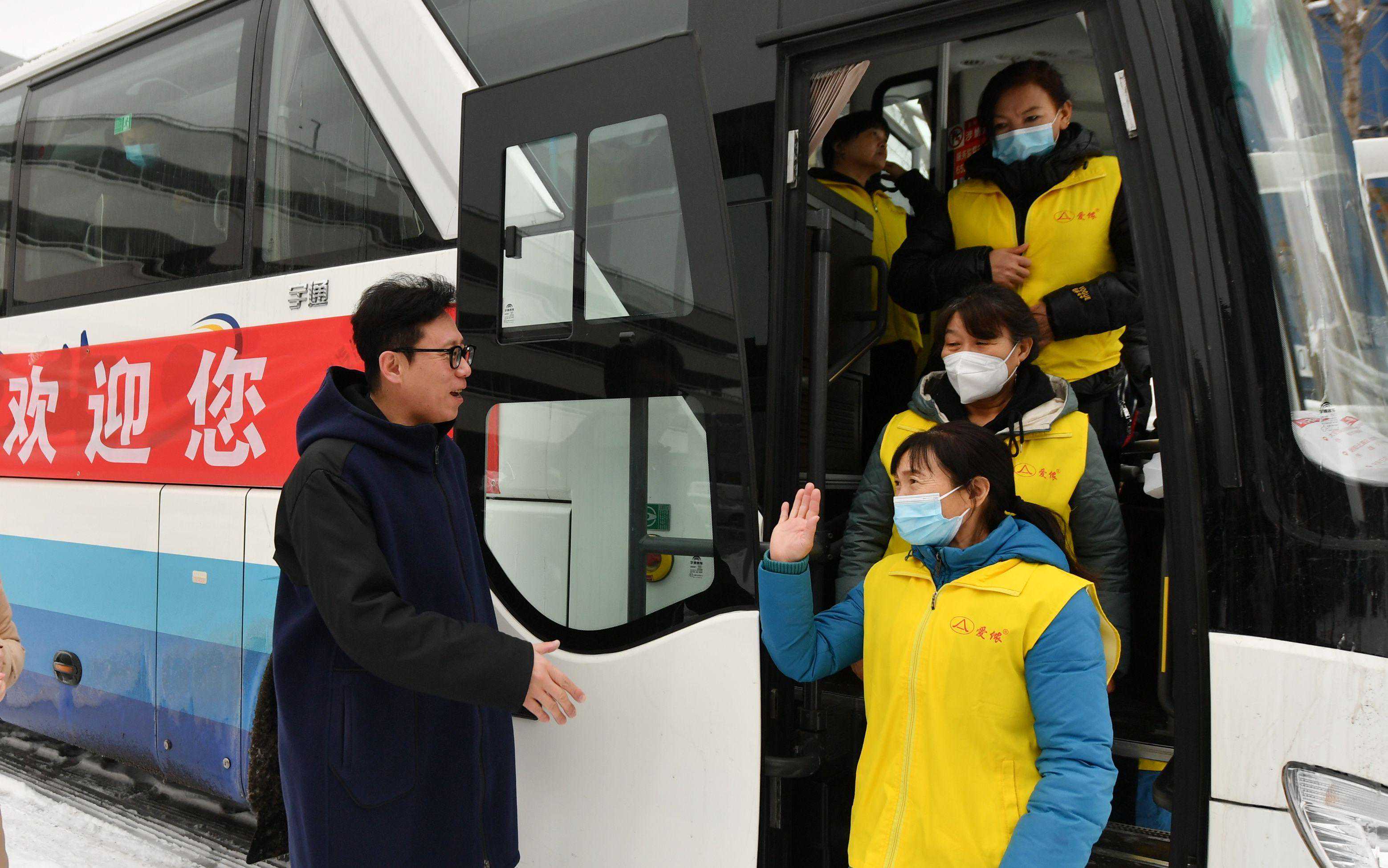 2月21日上午十点,在朝阳区人力资源公共服务中心门前,30余名务工人员走下大巴,在集体座谈后由专车分别送往振远护卫、爱侬家政、东方慧博等用人单位返岗复工。
