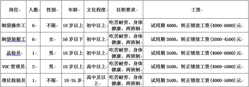 工作要求:男,28周岁—57周岁;女,28周岁—50周岁,身体健康,能遵守法律法规,服从公司安排和管理。