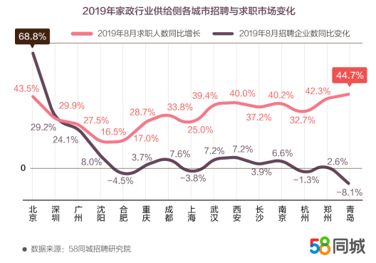 一线城市依然具备家政服务供需两旺的特征。报告显示,8月各城市家政服务招聘企业需求同比稳步增长,北京增长最高为68.8%,其次是深圳、广州等城市。经济发达、产业健全的一线城市家政服务需求整体旺盛并有广阔市场潜力。