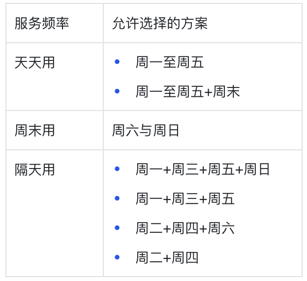 总结来说,套餐的形式为:天天用、周末用、隔天用。天天用、隔天用还提供周末是否需要附带的组合形式,最大程度的满足不同服务时间频次下的诉求。
