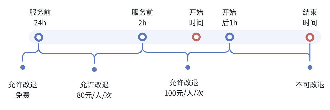 服务开始时间前2小时至服务开始后1小时内,收取100元/人/次的改退费。