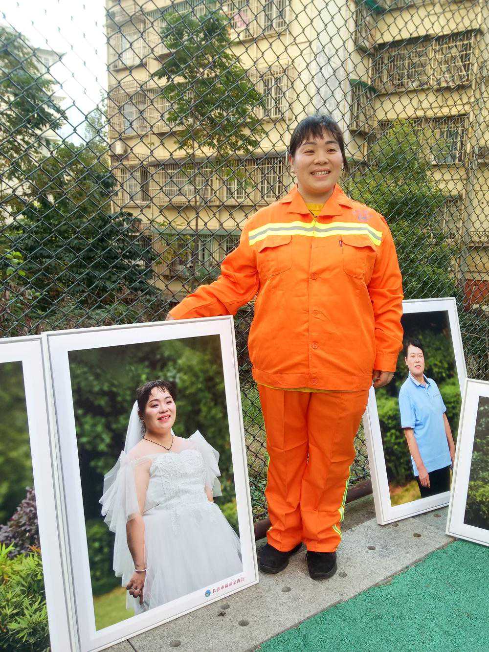 参加仪式的10多名环卫工中,除了夫妻拍婚纱,也有不少人拍个人写真照。39岁的刘叶花是其中之一,她喜欢拍个人写真,17岁时拍第一张写真的场景,至今历历在目。刘叶花回忆,当时家庭贫困,“吃饭连菜都没有”,读完初中她就去县城一家店铺打工,一个月工资300元。