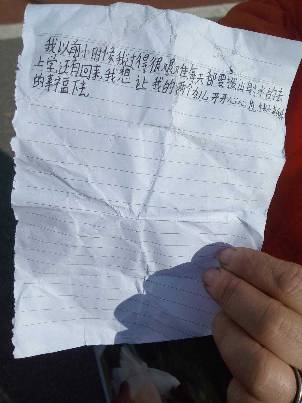 提起孩子,刘叶花来了兴致,说昨天晚上大女儿正在写作文,得知自己今天要去领照片,会有记者采访她,于是专门给她写了一篇“发言稿”。内容是:“我以前小时候过得很艰难,每天都要拨山涉水的去上学,还有回来。我想让我的两个女儿开开心心也快快乐乐的幸福下去。”刘叶花表示,写完女儿还告诉她,“说妈妈你说话说不出,我帮你写一点你心里话。”看到如此贴心的孩子,刘叶花很感动,“其实我好幸福,两个孩子都很懂我。”