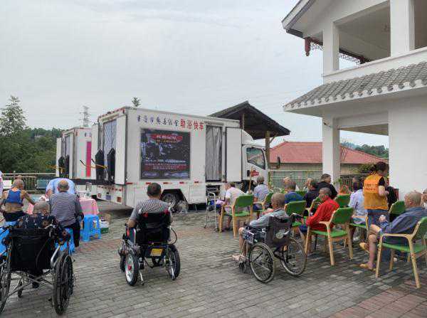 “助浴快车”在重庆乡下为老人进行助浴服务,老人们在排队等候。(受访者供图)