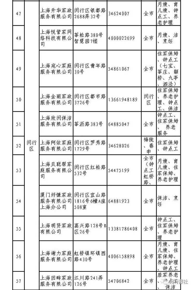小编发现,其中所属区域属于闵行区的有上海升华家政服务有限公司、上海悦管家网络科技有限公司、上海宛心家庭服务有限公司等11家企业。