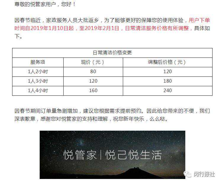 上海悦管家网络科技有限公司则已做出相应的价格调整,以日常清洁服务为例,因春节临近,家政服务人员大批返乡,该服务从2019年1月10日起,至2019年2月1日,日常清洁服务价格已有所调整。