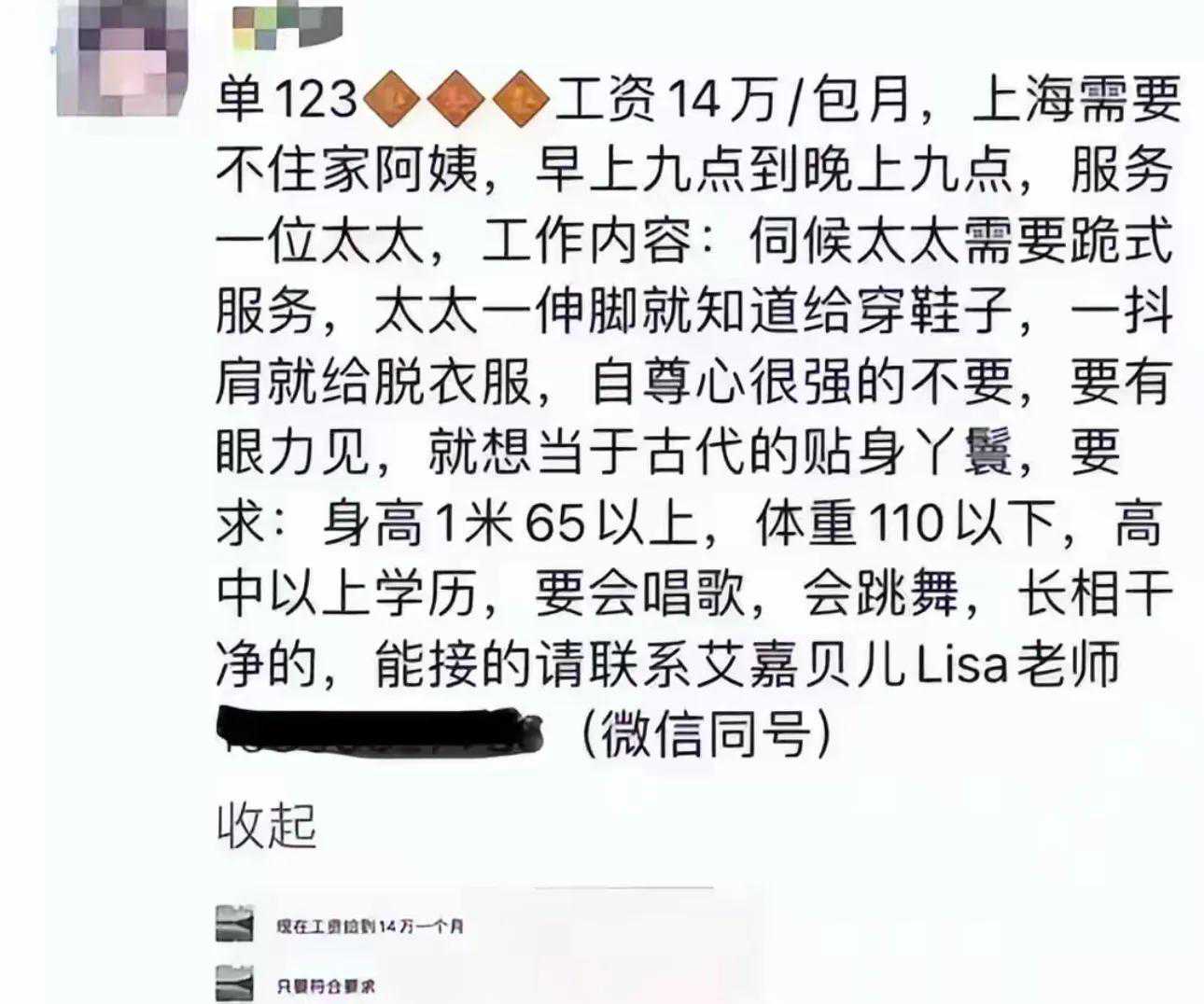 招聘广告的一般内容是上海富太招聘住家保姆,月薪14万。但与惊人的高薪相比,要求也极其“苛刻”,甚至没有尊严和道德底线。招聘要求必须是照顾妻子需要跪着服务,妻子伸出脚知道穿鞋,摇肩脱衣服,强烈的自尊,相当于古代个人女仆等等,真的让一个人看到惊讶,惊呆。