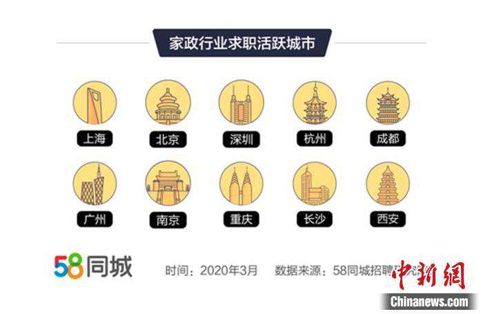 报告还称,今年3月,家政行业招聘活跃城市依次为成都、北京、重庆、深圳、东莞、广州、武汉、天津、上海、郑州。其中,重庆、武汉、天津企业招聘需求环比上升较快,环比增长超过200%,成都、东莞、广州企业招聘需求环比增长也达到100%以上。