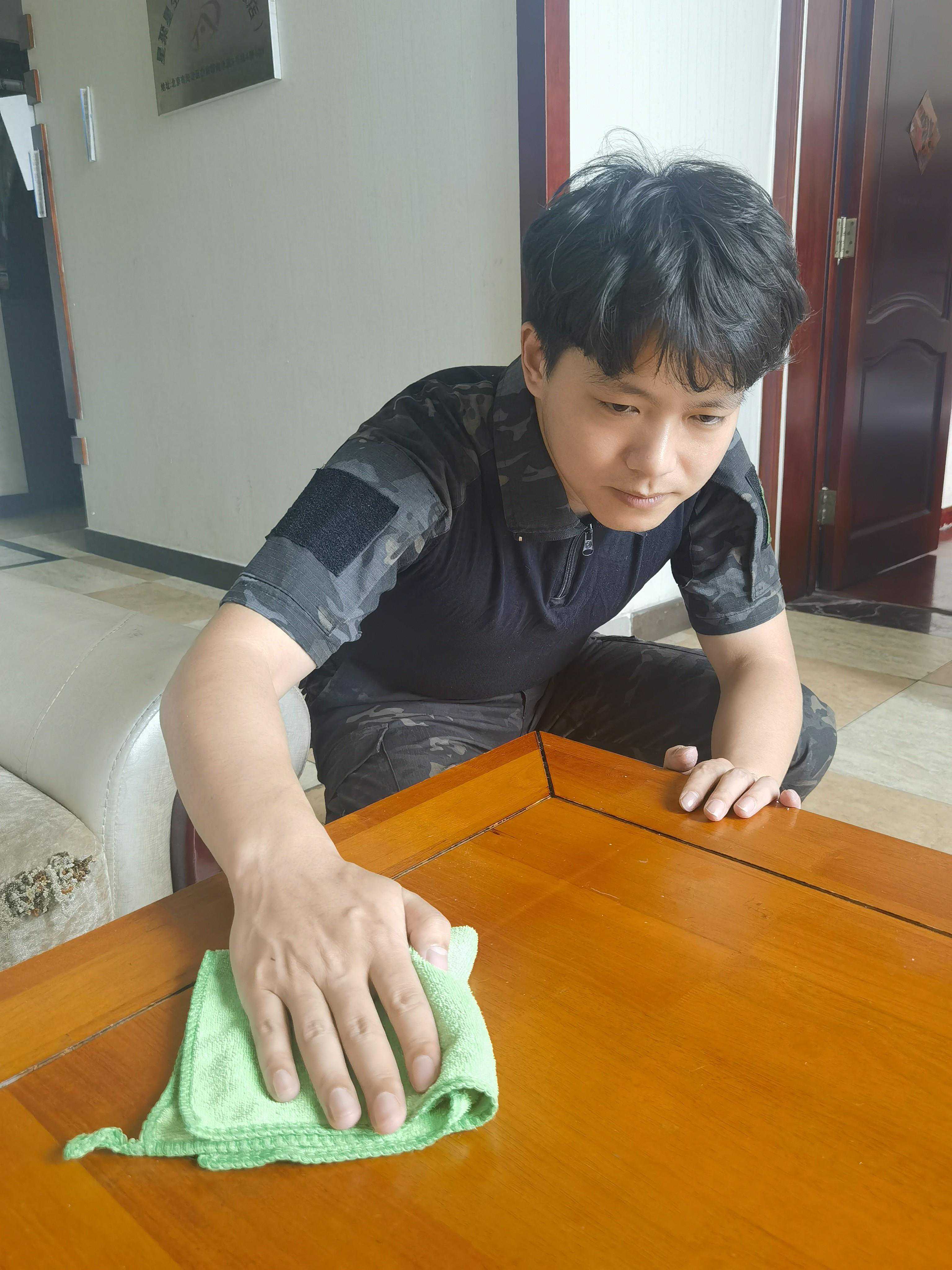 “白手套检查柜体,手套不能变黑”“地面斜光四十五度,无水渍、无污渍、无划痕”……渐渐地,这些部队式的“硬杠杠”成了团队的“铁纪律”。邓明冬还和队员一起仿照部队模式,增设纠察人员,不定期上门突击检查队员的工作,不合格的全部要求重做。