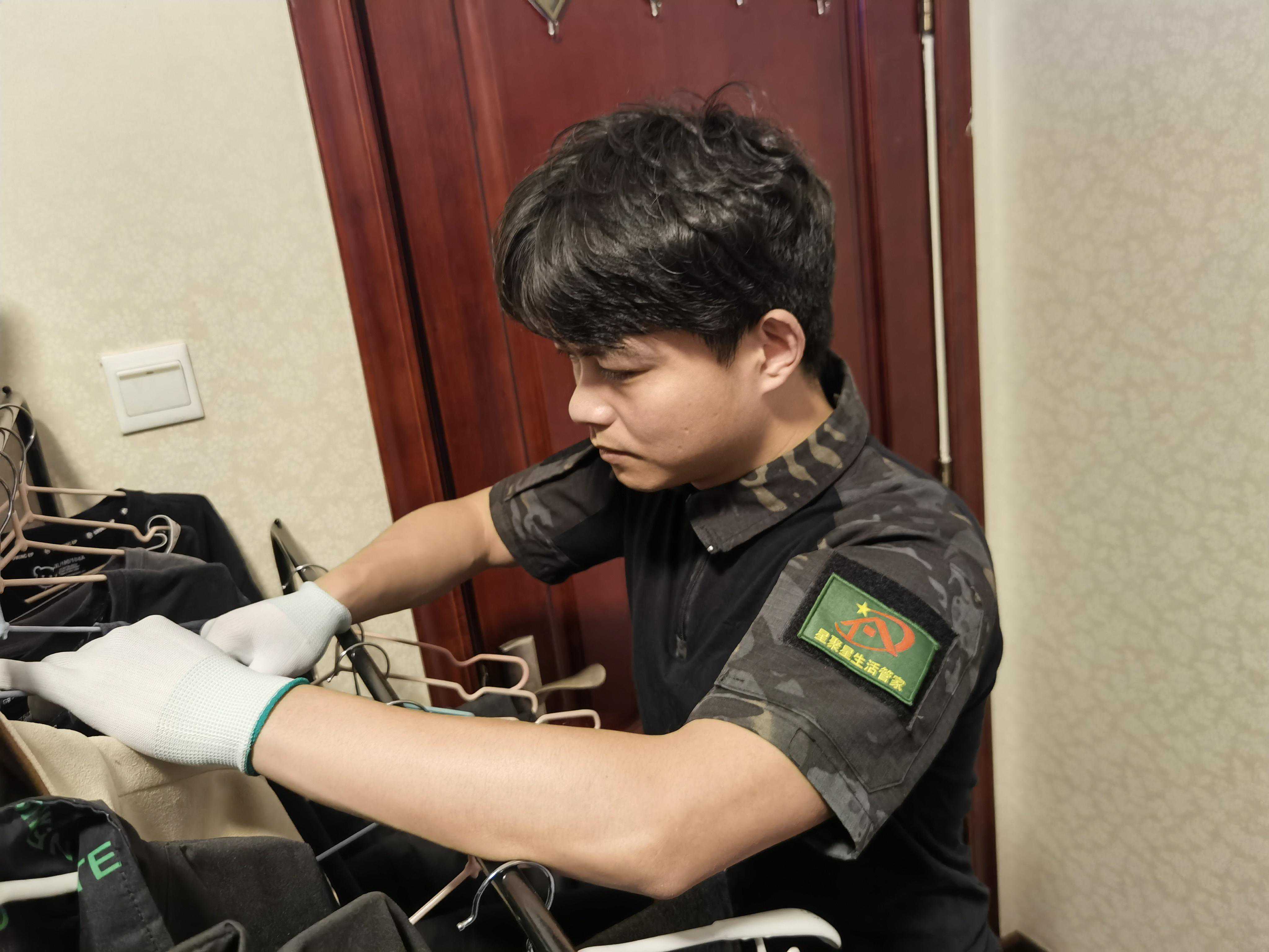 很快,退伍军人做整理收纳师的优势显露了出来。厨房里的瓶瓶罐罐按照高矮胖瘦摆得像战士列队一样整齐,床单、被褥、衣物收拾得平平整整,就连抹布都叠成了“豆腐块”。有客户欣喜评价,不愧是军事化标准的保洁服务。