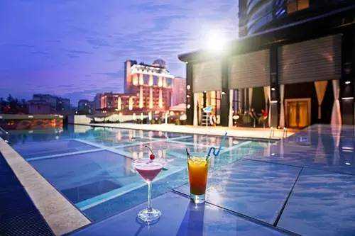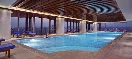 特色:位于5层的室外游泳池。设有安全员。泳池边界的透明落地玻璃可欣赏成都的繁华景貌。更可在游泳池畔的泳池吧,点上一杯清凉酷爽的鲜榨果汁。