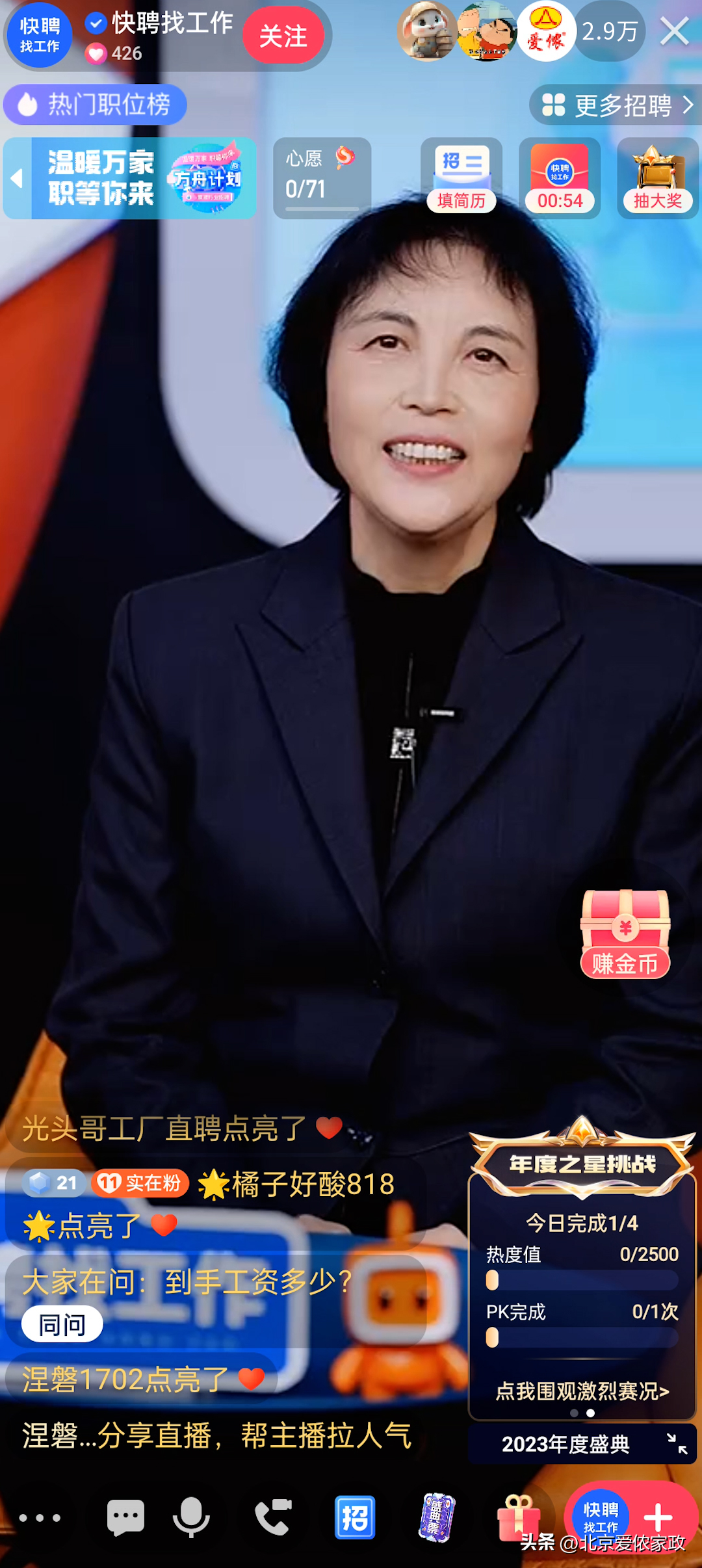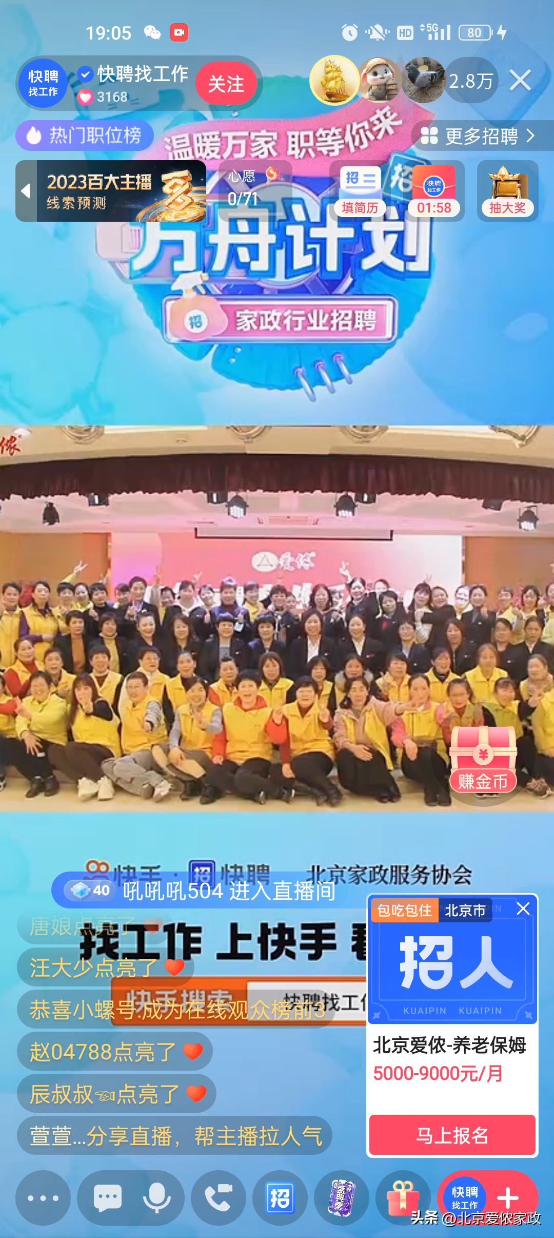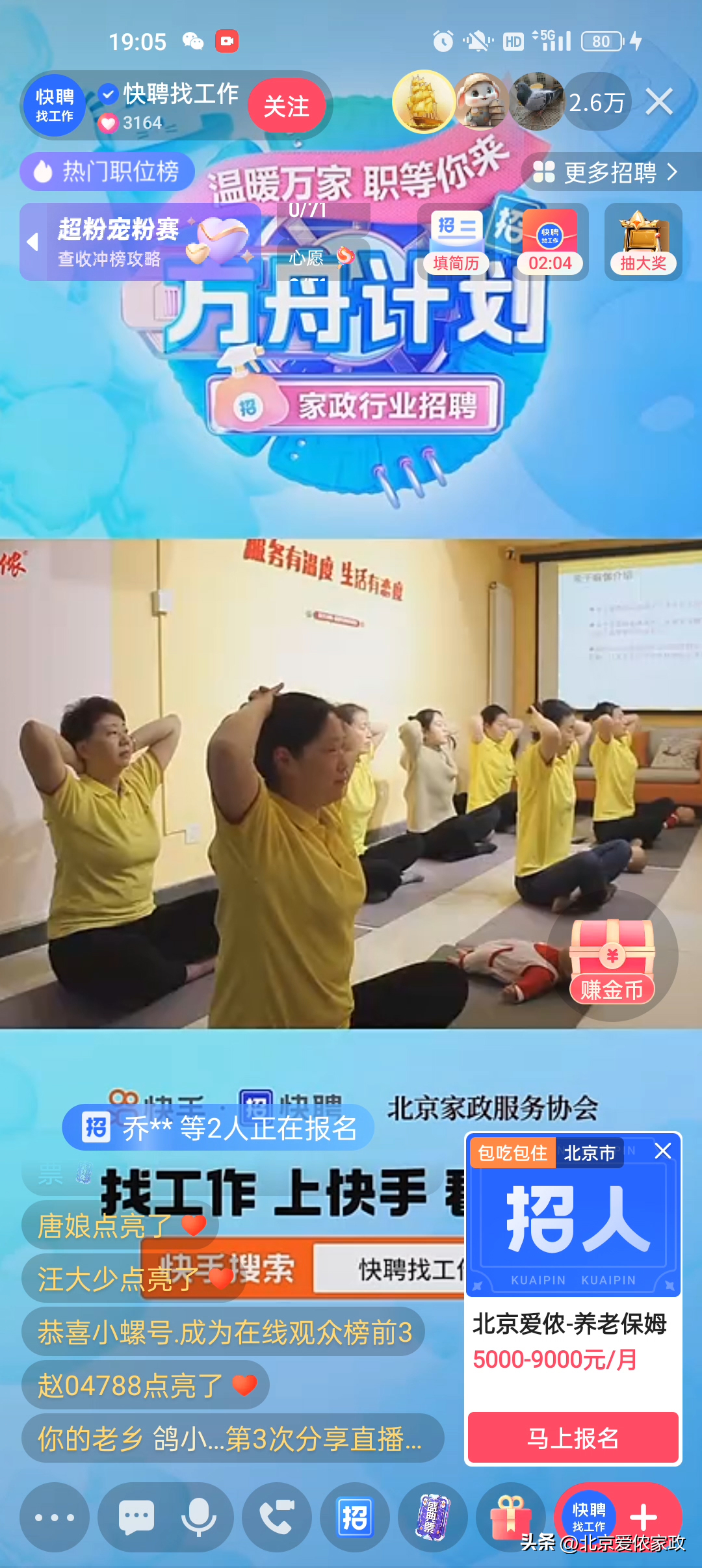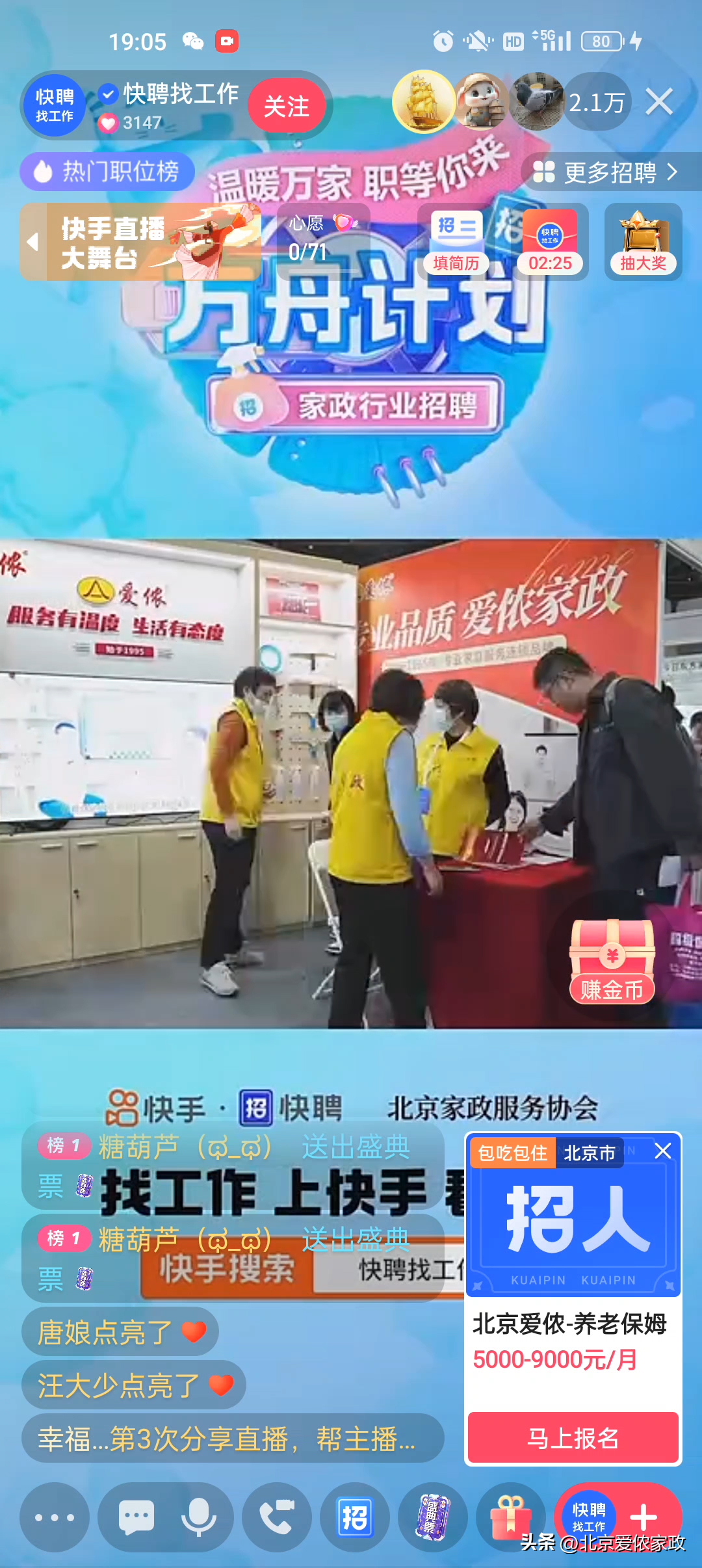 为全面贯彻落实家政市场春节保供工作部署,强化就业服务,促进人力资源供需匹配,搭建求职者与家政企业高效对接平台,12月19日晚,由北京市家政服务协会主办、快手平台快聘板块承办的“温暖万家职等你来”家政行业专场招聘直播温暖开启,来自北京的多家家政机构空降直播间,为广大求职者带来了海量优质岗位及专属幸运好礼。北京爱侬作为北京家政服务协会会长单位亮相直播间。