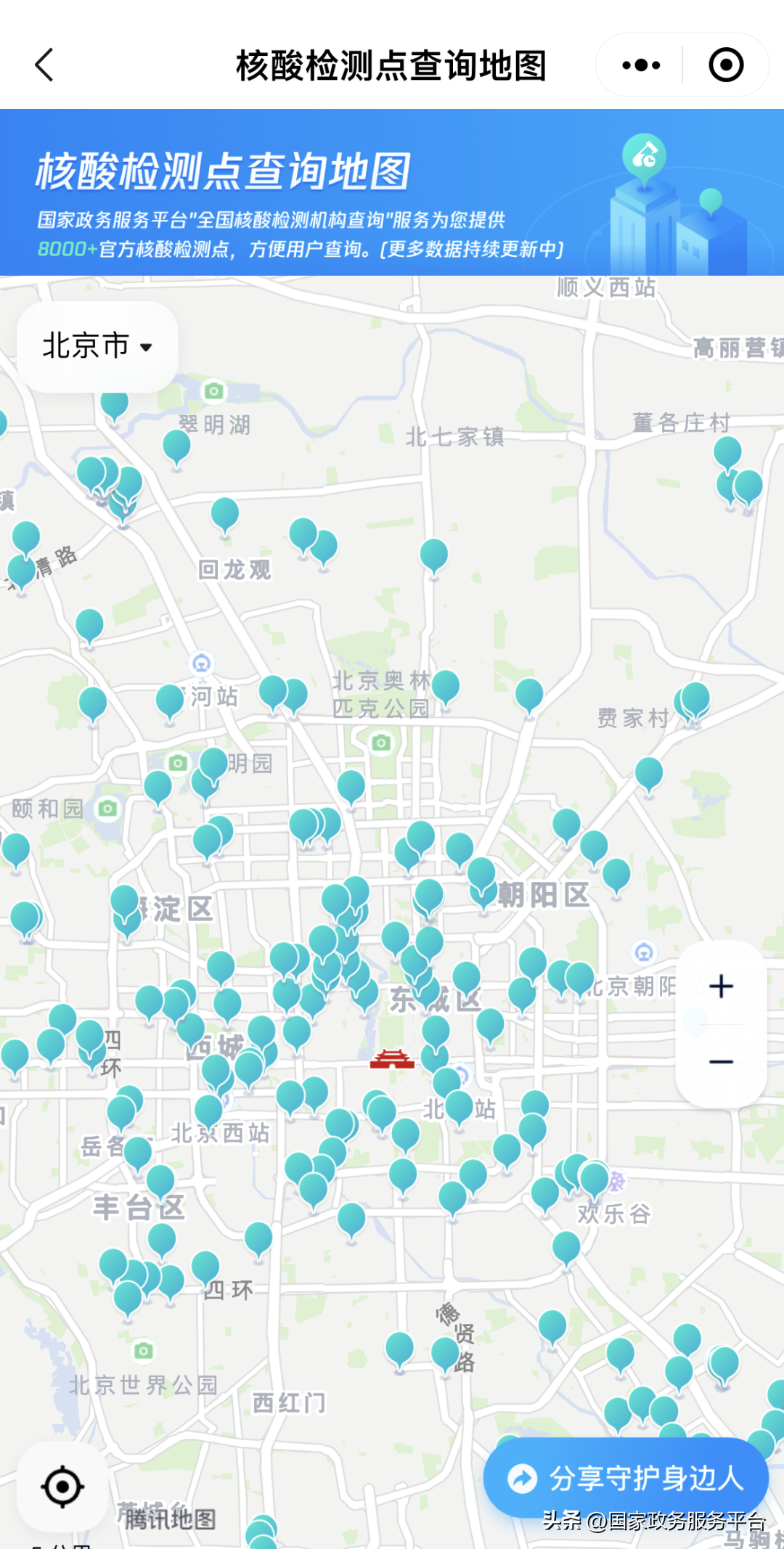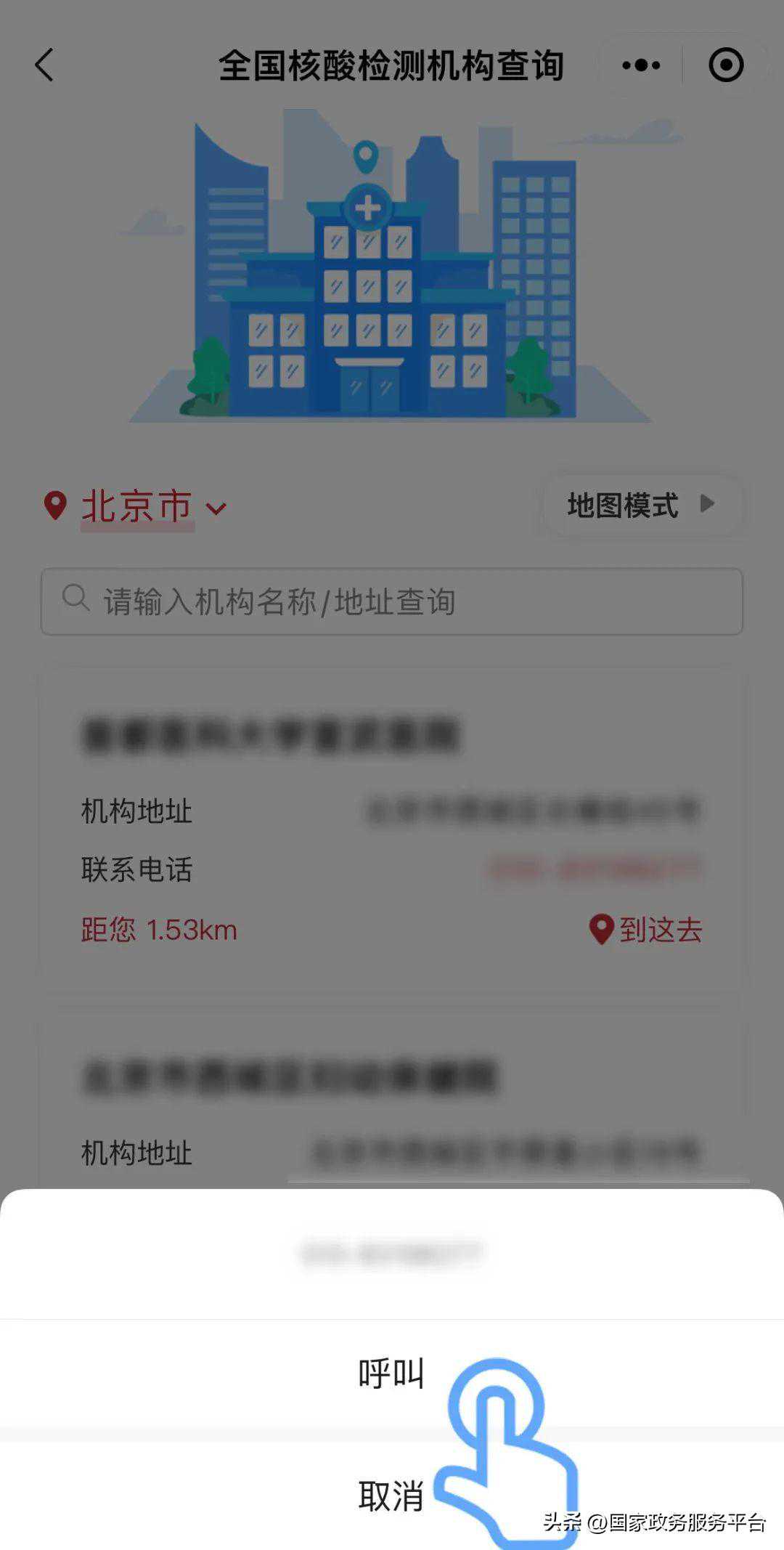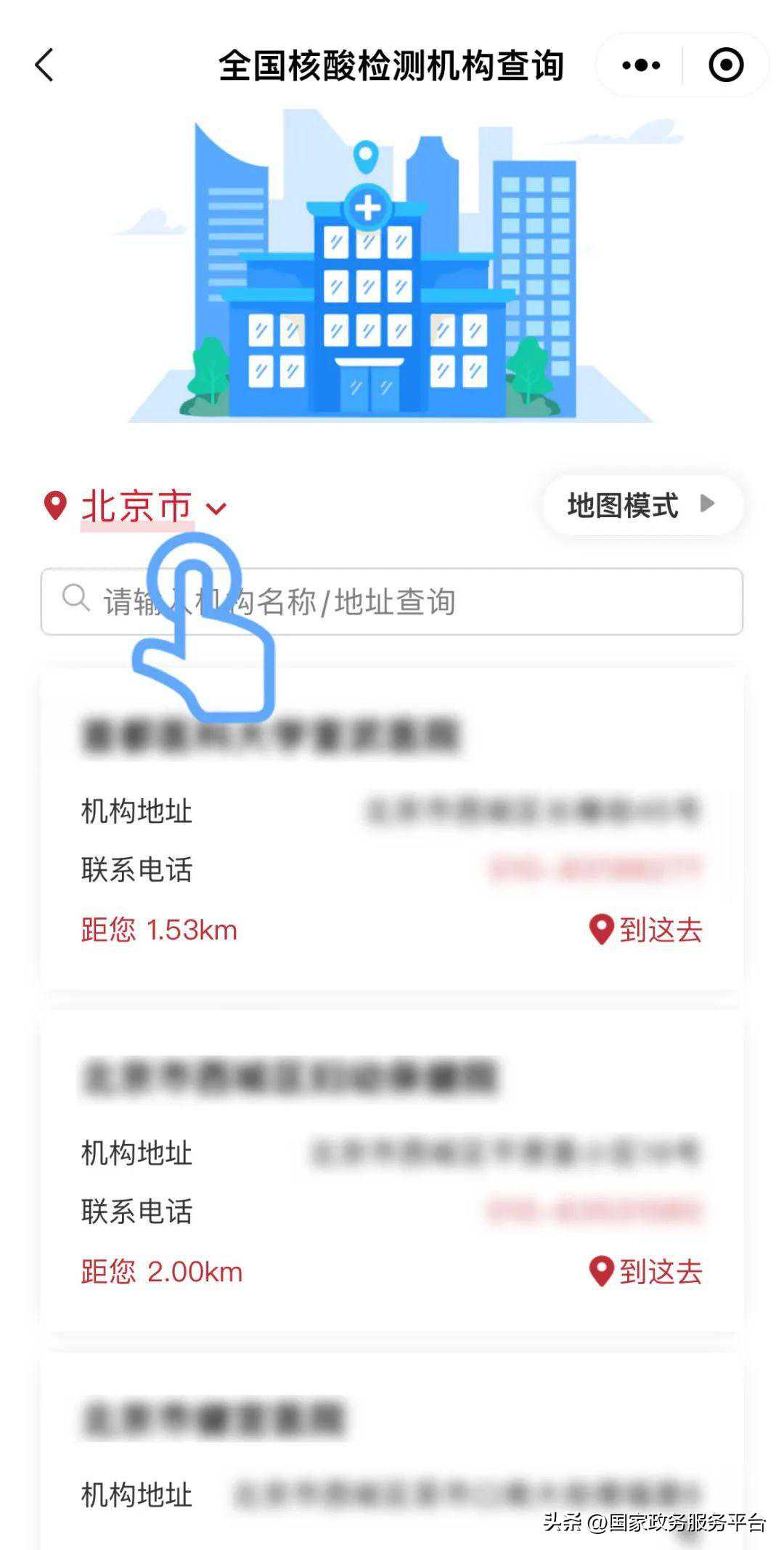 查询机构:进入服务后,选择所在省份及城市,或输入机构名称/地址等关键字,即可显示该区域的核酸检测机构地址及联系方式。通过切换“地图模式”可进入“核酸检测点查询地图”进行查看。