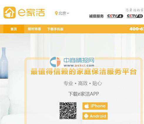 公司定位于经济型保洁市场,起步基于LBS在移动端寻找保洁人员,用户可在应用软件中发起订单,订单依据地理位置推送到附近的保洁人员手上,保洁人员可以自助接单、预约并提供上门服务。目前主要为日常清洁、洗衣、收纳、新居开荒、家电清洗、家具养护、下水管道疏通和企业保洁等,目前北京、上海、广州、深圳、南京、成都等25个城市均有覆盖。