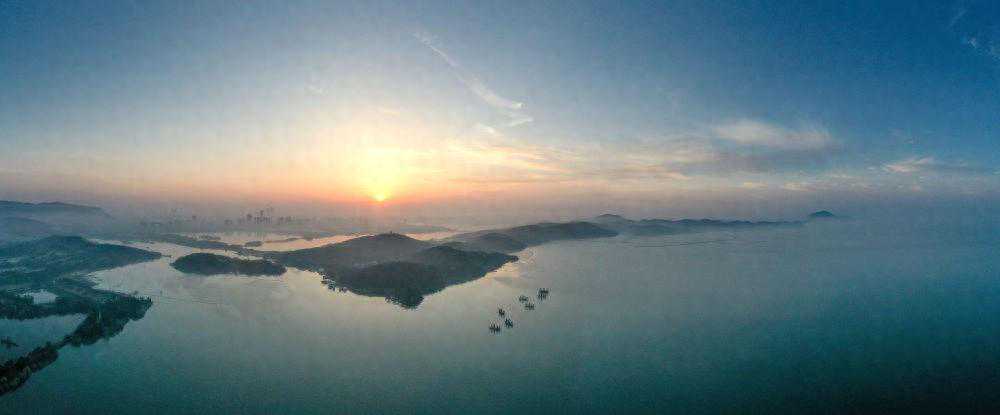 初升的太阳照耀在太湖之滨的鼋头渚景区(无人机全景照片)。本报记者杨磊摄