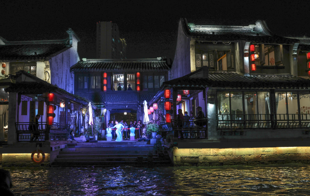 昔日工业遗产,化作条条“水弄堂”。入夜,清名桥历史文化街区迎来一天中最动人的时刻。人们乘坐画舫穿梭在桨声灯影里,两岸的丝厂、茶楼、书场、戏台等古迹勾勒出迷人的水乡景致;岸上,前店后坊人头攒动,人们品尝着美食、香茗,陶醉于夜色下的江南风情。
