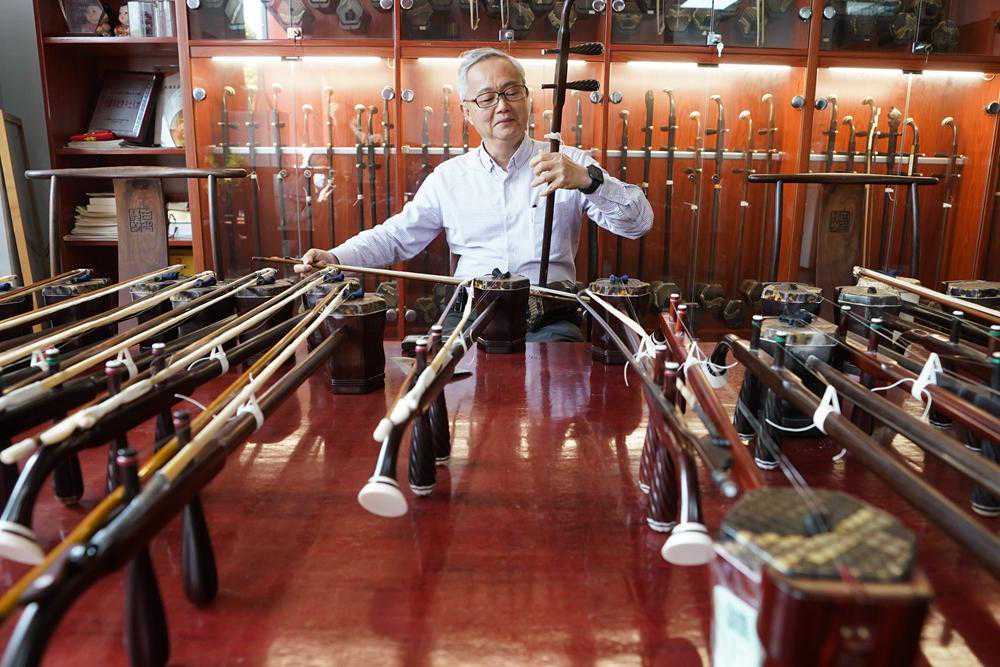 香港乐器经销商在无锡梅村街道二胡产业园古月琴坊车间内试琴(2023年3月28日摄)。本报记者季春鹏摄