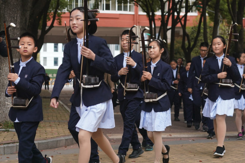 江苏无锡梅村实验小学二胡社团学生在校园内(2023年3月29日摄)。新华社记者季春鹏摄